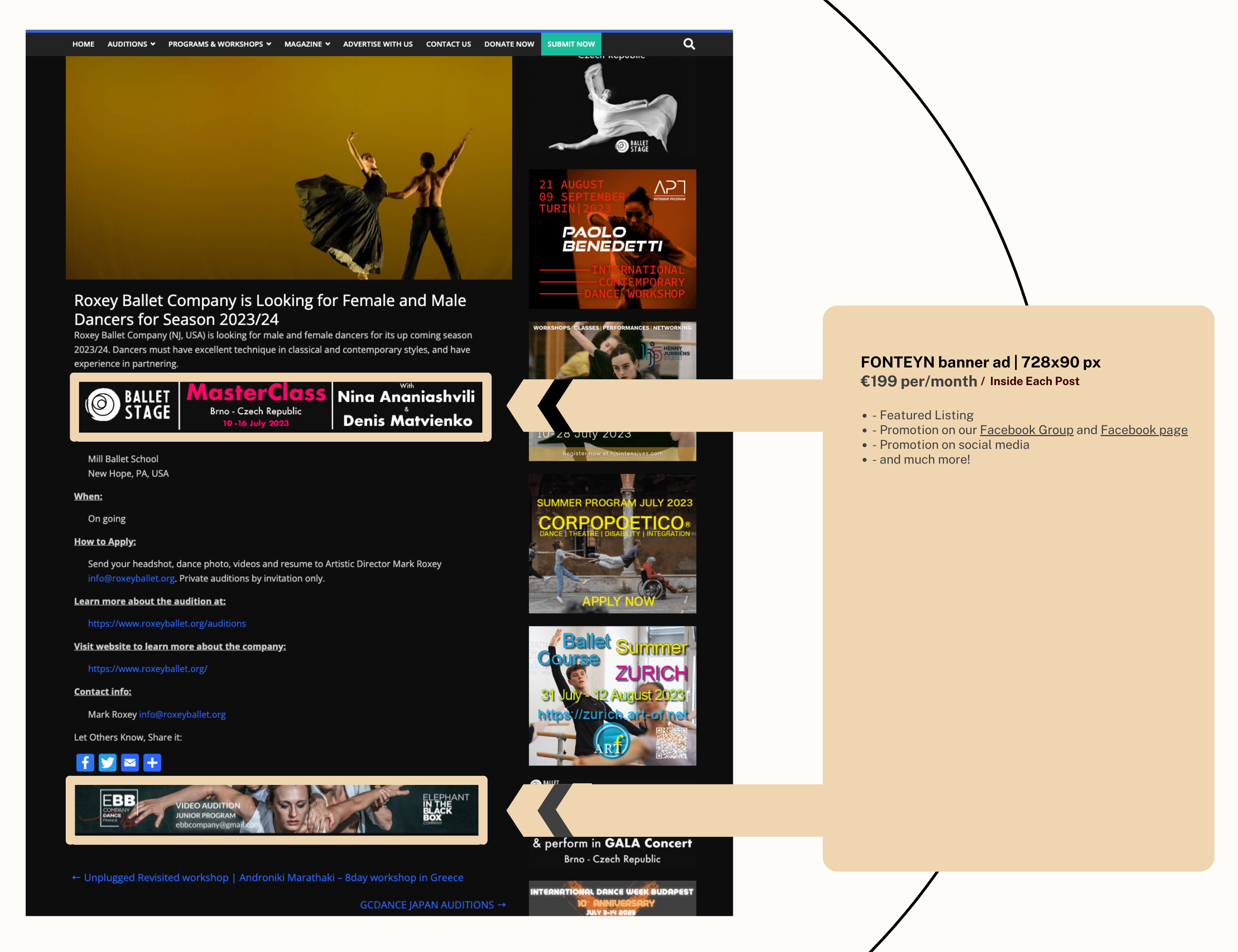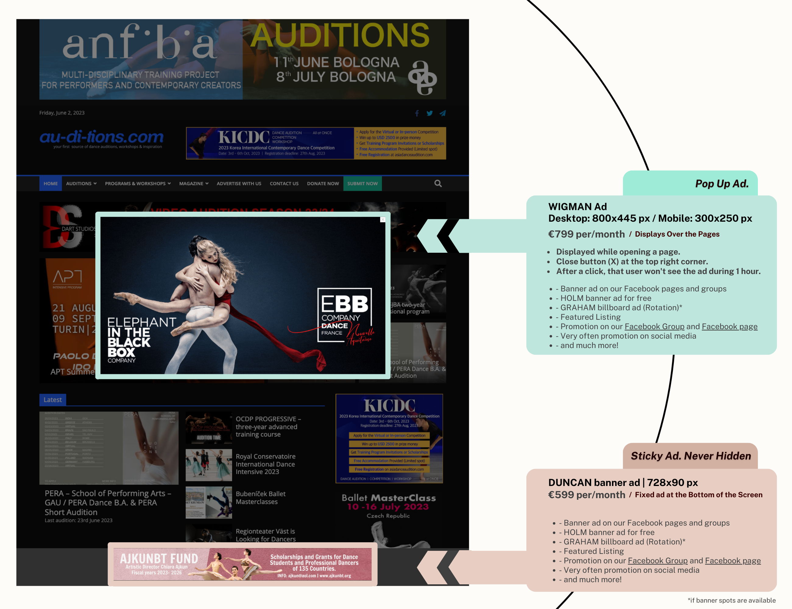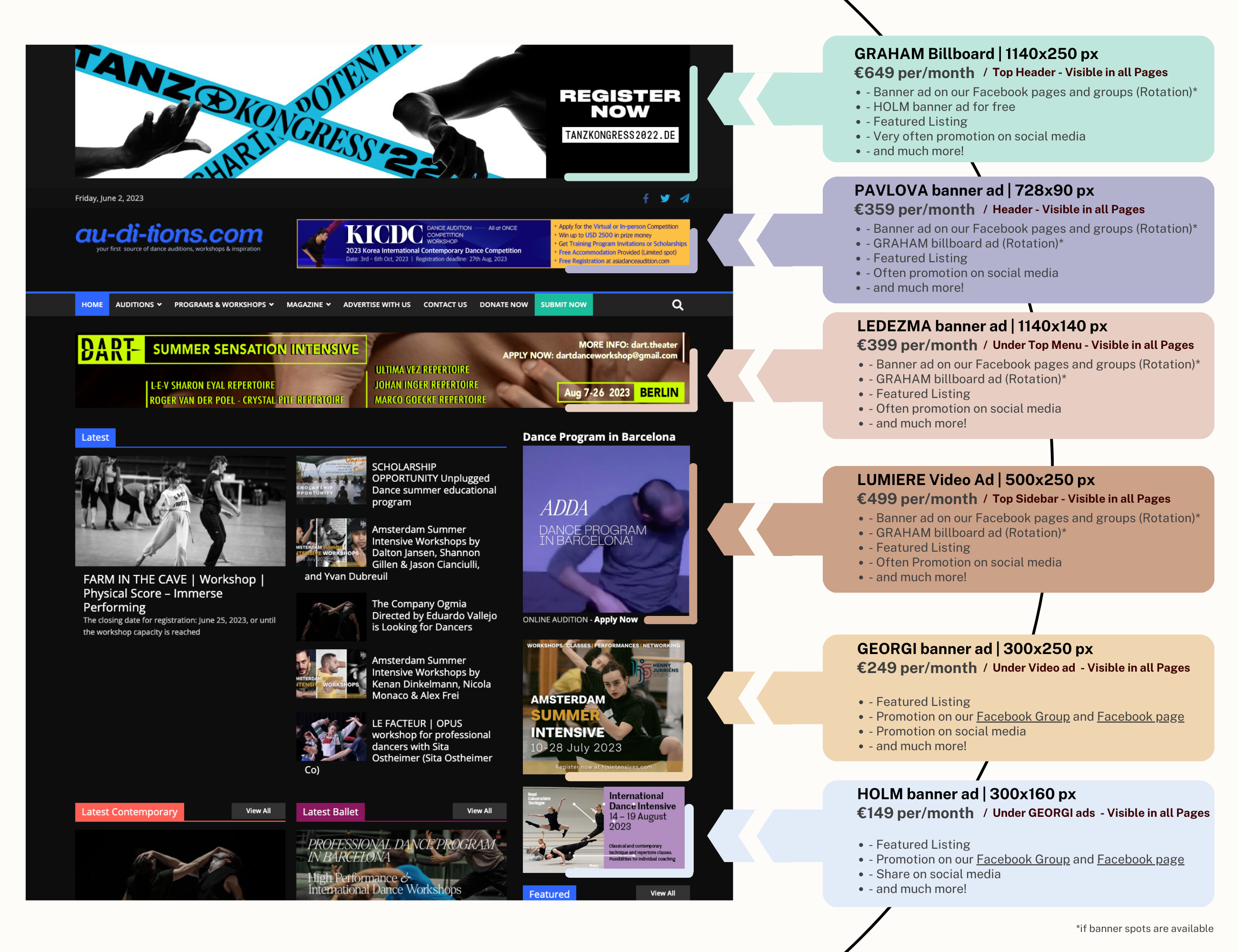 We publish your banner ad in au-di-tions.com. It is the #1 website for professional dance auditions and dance workshops from around the world. Every month, au-di-tions.com reaches more that 125.000 unique readers from across the dance sector. Beside the banner ad, we create a post/listing with the information of your event and publish it on au-di-tions.com, danceandeducation.com, in our partners' websites and share it regularly on social media.